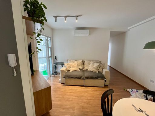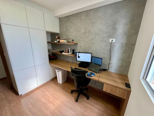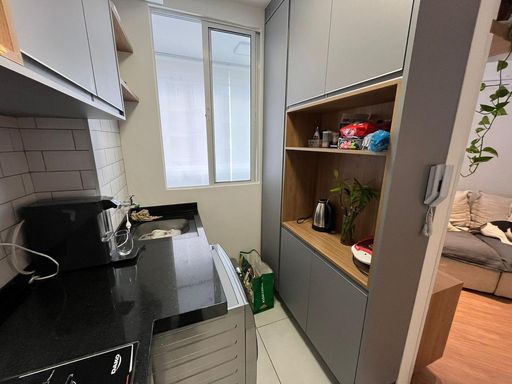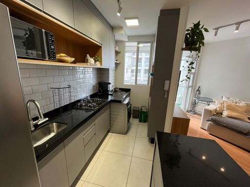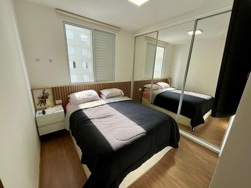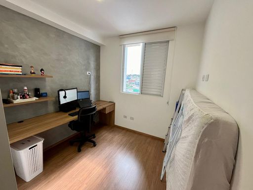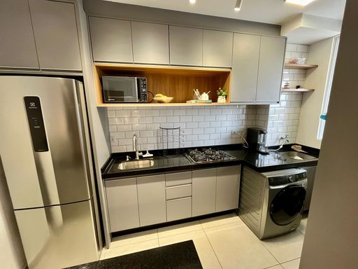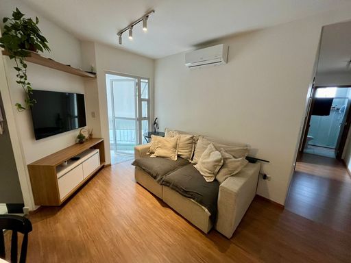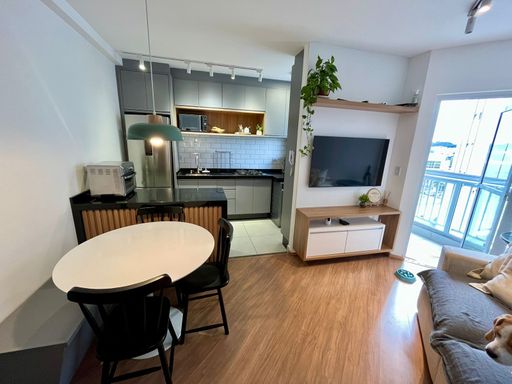 O imóvel conta com 2 dormitórios, 1 banheiro, sala de estar/jantar integrada, cozinha, lavanderia e sacada. Possui ainda 1 vaga de garagem, móveis planejados e piso laminado.
