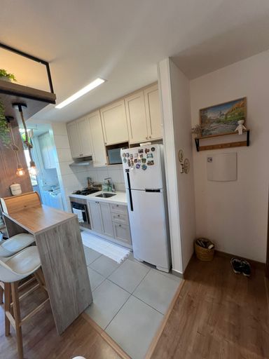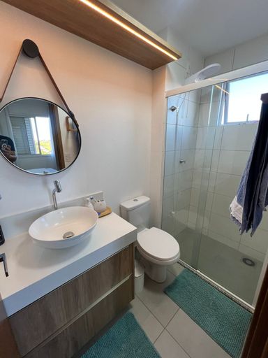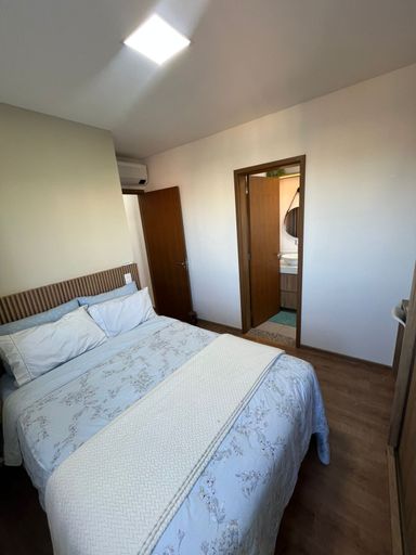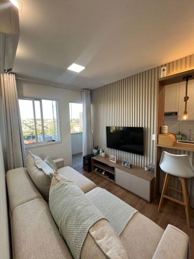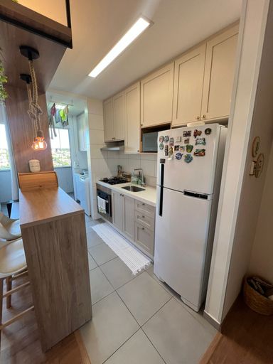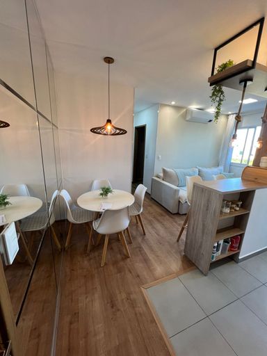 O imóvel conta com 2 quartos, sendo 1 suíte, 2 banheiros, sala de estar e jantar, cozinha, lavanderia e 1 vaga de garagem. Possui móveis planejados, 2 guarda-roupas e permanecem no imóvel 2 aparelhos de ar-condicionado, fogão, forno, sofá, mesa e micro-ondas, oferecendo praticidade e economia.
