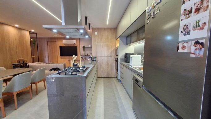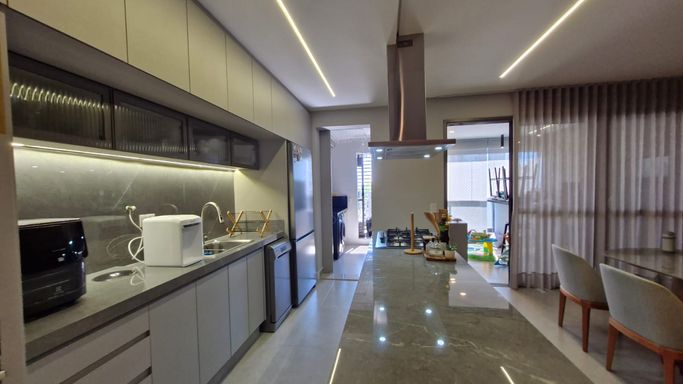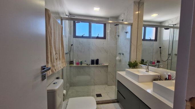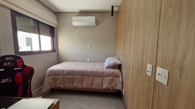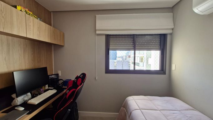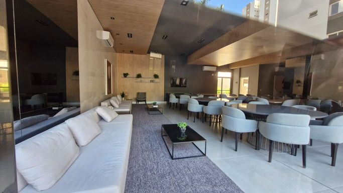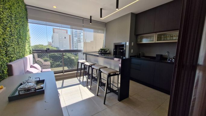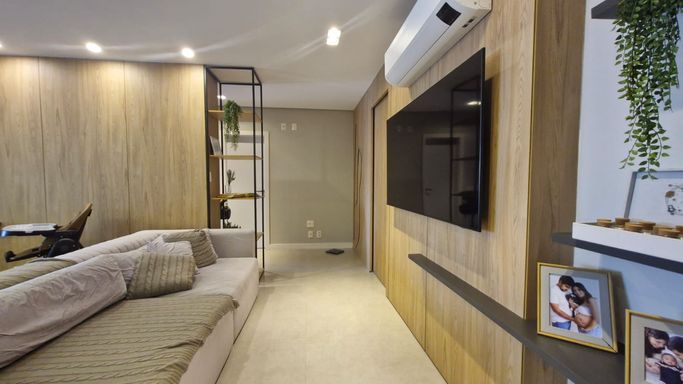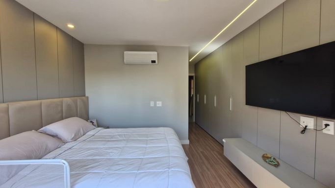 O apartamento possui móveis planejados e ar-condicionado, proporcionando mais comodidade em todos os ambientes. Conta ainda com 2 vagas de garagem.