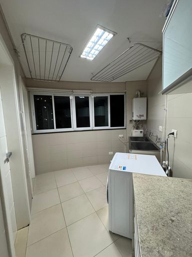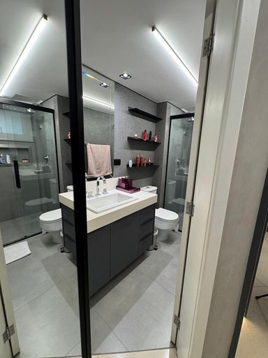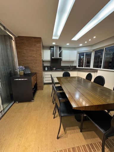 Possui amplas salas de estar e jantar, sacada, cozinha planejada e lavanderia. Conta com três vagas de garagem, box individual e área de lazer completa com piscina coberta e sauna.
