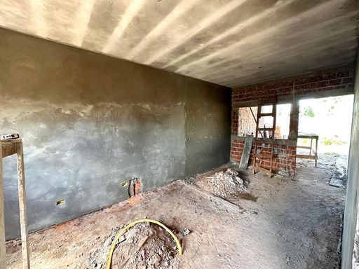 Serão 3 quartos, 1 banheiro, sala de estar integrada, cozinha funcional e 2 vagas de garagem.
